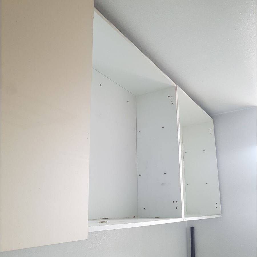 상부장의 무게를 줄이고 안전한 철거를 위해 먼저 앞쪽 문짝(도어)과 내부 선반을 하나씩 분리하였습니다.
